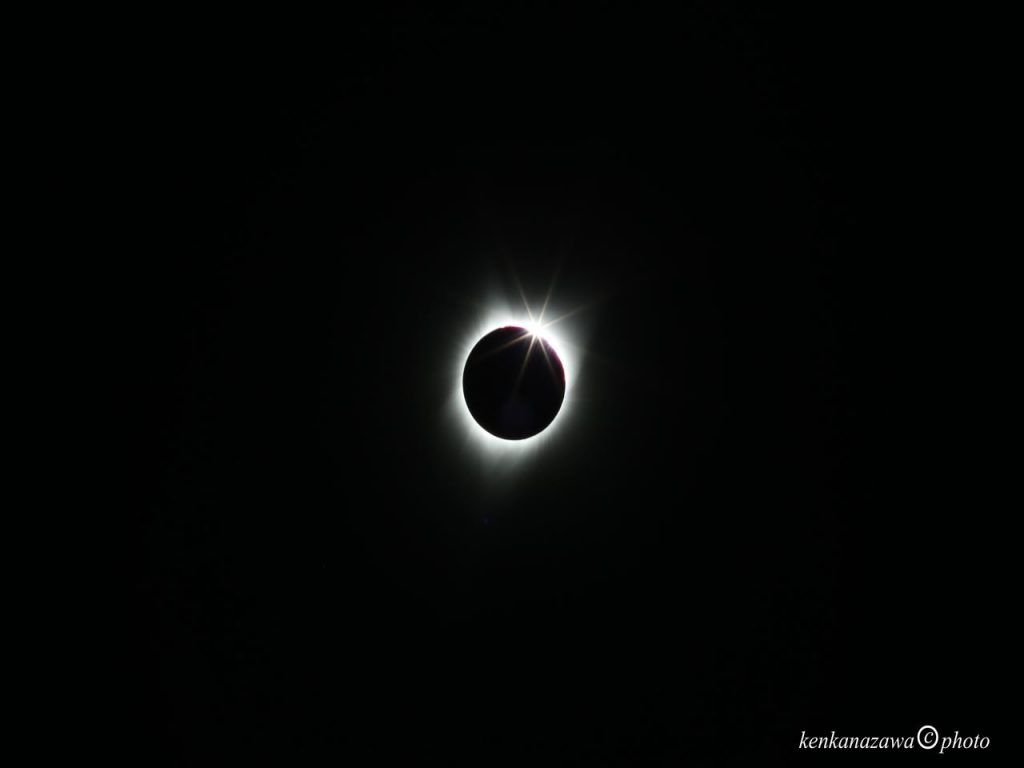 太陽が完全に月に隠れる現象で月が太陽よりも大きく見える時に起きる。楕 円形の公転軌道をまわっている月は、地球に近づくほど大きく見えコロナが美しい。又、地 球が太陽を巡る軌道も楕円形で、太陽に近づいたり遠ざかったりする。この組み 合わせによって、月が太陽よりも大きく見えるほど、皆既継続時間は長くなる。